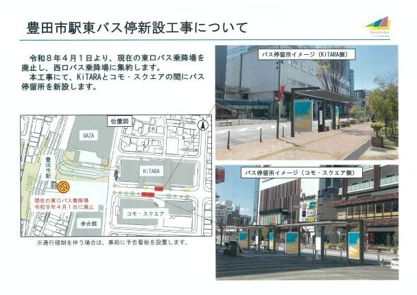 豊田市喜多町地内におきまして、豊田市駅東バス停新設工事が行われます。