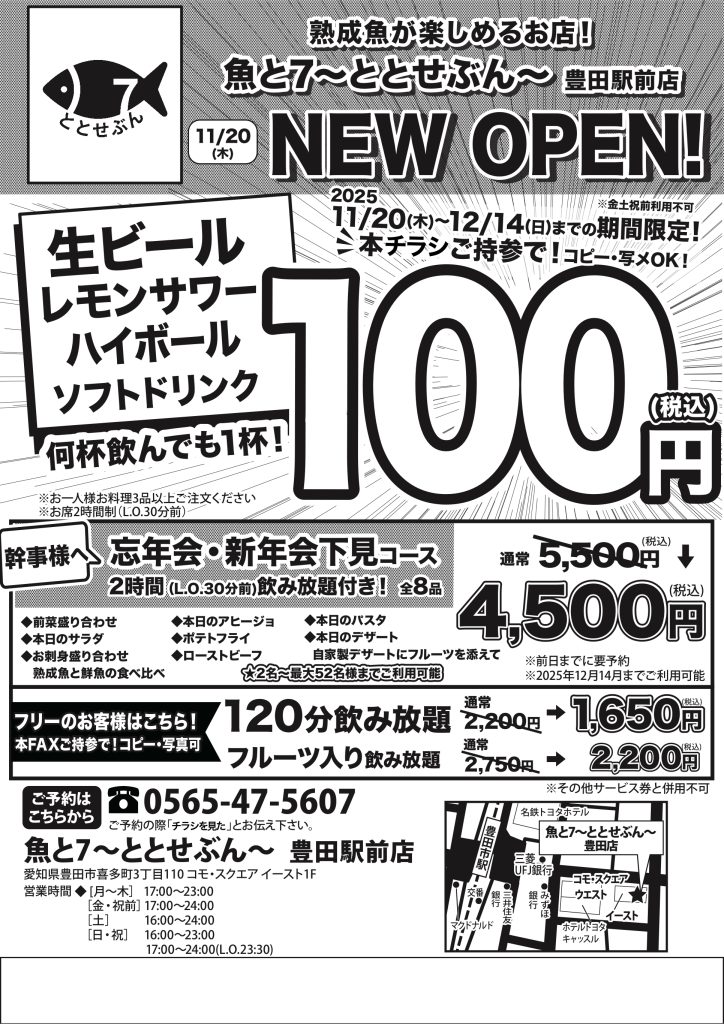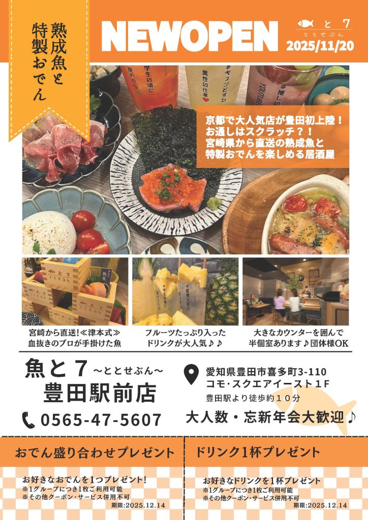 11月20日(木)魚と7~ととせぶん~豊田駅前店 オープン!!