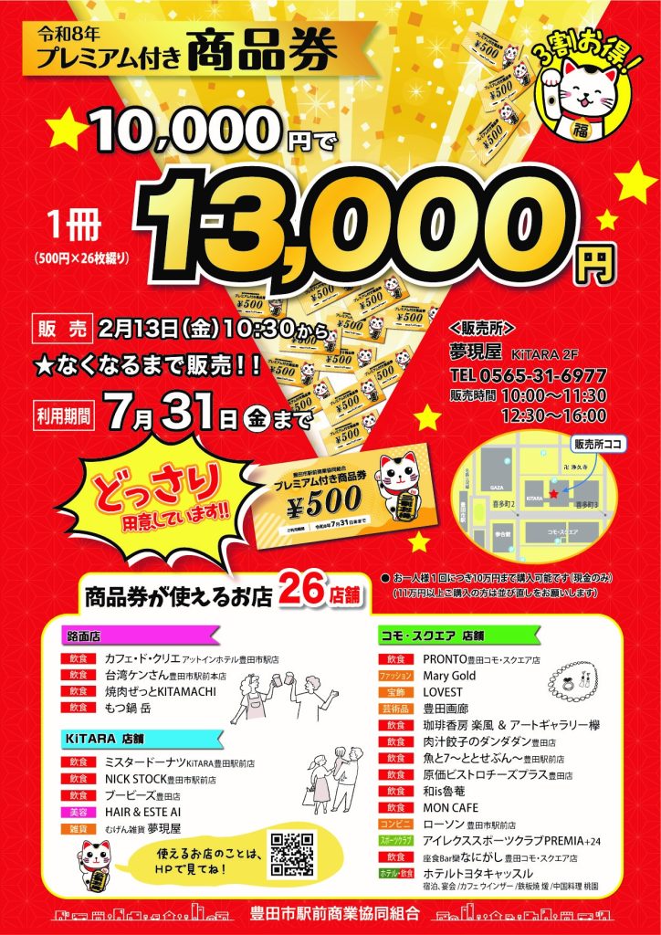 ◆販売場所:豊田市駅前商業協同組合事務局(KiTARAグリーン棟2F 夢現屋内)